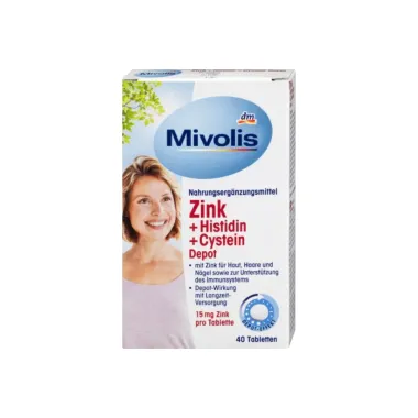 Mivolis cink + histidina + cistein depo tablete zahvaljujući cinku potiču normalnu funkciju imunološkog sustava. Cink kao važan dio brojnih enzima doprinosi održavanju normalne kose, noktiju i kože, štiti stanice od oksidativnog stresa i doprinosi normalnoj funkciji imunološkog sustava. Mivolis tablete sadrže i aminokiseline histidin i cistein koji su sastavni dijelovi brojnih proteina.