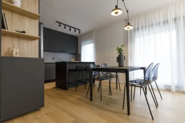 Kompletno uređenje stana je u minimalističkom i suvremenom štihu, a u skladu s tim odabran je stol na razvlačenje jednostavnih linija, a kombiniran je s tamnim stolcima sa sjedištima od plastike. "U odabiru namještaja za suvremen tip uređenja, obratite pozornost na materijal i model. Kada je riječ o stolcima neka budu ili s kožnim tapeciranjem ili plastični. Što se stola tiče, obratite pozornost na nogice – što jednostavnije to bolje. Kao i za stolce, birajte tamnu metalnu obradu", savjetuje dizajnerica Mirjana Mikulec.