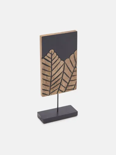Drveni ukras s printom lišća sjajno će izgledati na polici.