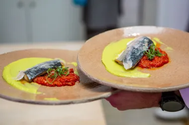 Skuša je malo kompleksnija, prvo ju treba očistiti i izvaditi svaku kost. Zatim se priprema temeljac od kostiju, za početak se karameliziraju kosti te kuhaju s povrćem (mrkva, celer, pastrnjak) i doda se mrvica soja sosa. U tom temeljcu se marinira skuša, a tako pripremljena riba stavi se u pećnicu koja radi na paru - osam minuta na sto stupnjeva. Na taj način se zadrže fini i nježni okusi, a preko skuše su stavili domaću sušenu obrazinu, samo se dodaju na toplu skušu koja se smekša i dobije jednu finu masnoću. Kako chef Skoko naglašava, masnoća je ta koja nosi okuse, a jelo je na kraju ukrašeno mladim lukom.