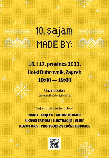 Deseti jubilarni sajam kolektiva MADE BY održava se 16. i 17. prosinca u Hotelu Dubrovnik, a okupit će oko pedesetak dizajnera, umjetnika i kreativaca iz Hrvatske i regije. U dvodnevnom druženju moći ćeš istražiti ponudu novih, ali i već poznatih brendova te kupiti unikatnu odjeću, nakit, modne dodatke, ukrase za dom, torbe, proizvode za djecu, prirodnu kozmetiku, ilustracije, keramiku, proizvode za kućne ljubimce. Radno vrijeme sajma je od 10 do 19 sati oba dana, a na sajmu su dobrodošli i četveronožni prijatelji. Više informacija pogledaj ovdje.