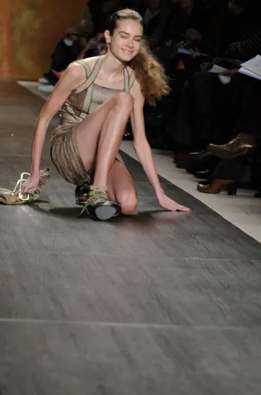 S time se suočila i manekenka koja je 2009. godine nosila reviju francuskog Hervea Legera. U jednom se trenutku, očito, poskliznula, no dočekala se rukom na podu i nastavila hodati.
