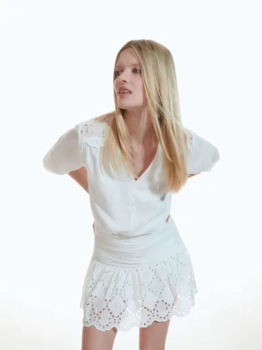 Kratka haljina s rupičastim vezom i V-izrezom.
