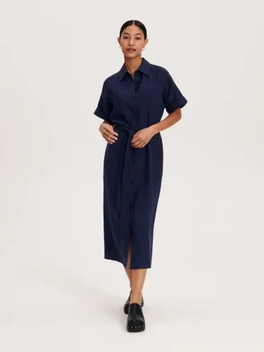 Midi košulja-haljina izrađena od pamuka. Preklopni ovratnik i kratki balon rukavi s manšetama. Pojas od iste tkanine s presvučenom kopčom. Kopčanje gumbima sprijeda.
