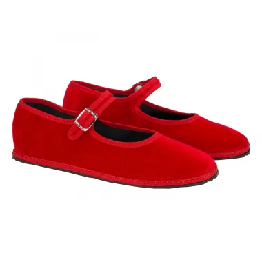 Neodoljive baršunaste cipele u crvenoj boji, u stilu Mary Jane cipela.