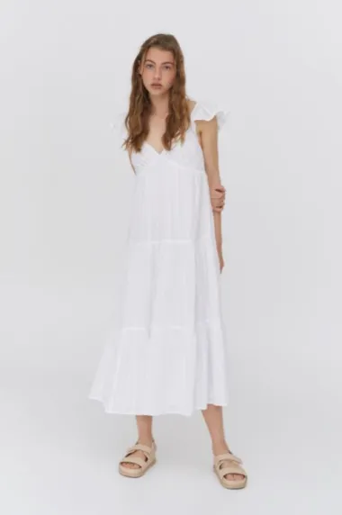 Ova midi haljina s naramenicama s volanima, V-izrezom, košaricama i vodoravnim prošivima izrađena je od 100 % pamuka i kao stvorena je za sve žene koje traže romantični bijeli komad.