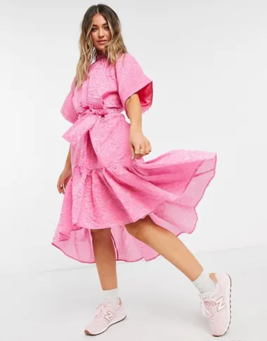Voluminozna baby pink haljina s pojasom oko struka i širokim rukavima svidjet će se svakoj ženi koja voli udobnost.