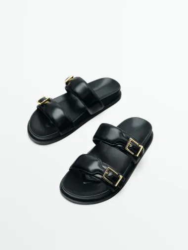 Ravne sandale s dvama remenčićima i metalnom kopčom. Zaobljeni vrh.