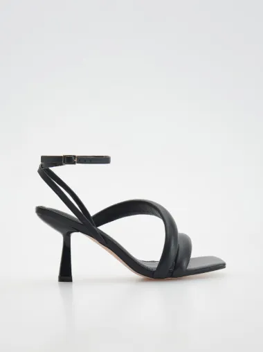 Sandale na visoku potpeticu s remenom oko gležnja. Kockasti izrez na prstima. Kopčanje metalnom kvadratnom kopčom.