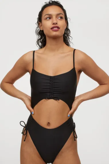 Crni kupaći kostim s vezicama oko trbuha neobičan je izbor u kojem ćeš se definitivno istaknuti iz gomile.
