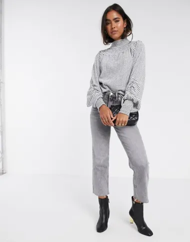 Karirani uzorak izgleda sjajno na ovoj crno-bijeloj bluzi s visokim ovratnikom.