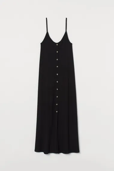 Ova rebrasta crna midi haljina na kopčanje sjajan je ulov za sve modne minimalistice.