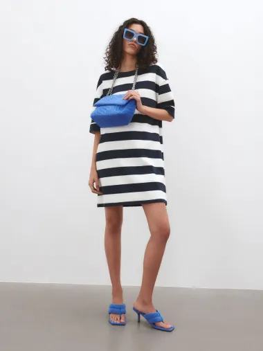 Prugasta haljina u stilu majice, širokog kroja. Idealna za plažu i druge ležerne prigode.