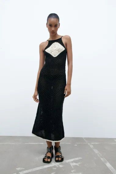 Duga heklana haljina s V-izrezom, rupičasto pletenim detaljem, naramenicama koje se križaju straga, prorezom sa strane i podstavom.