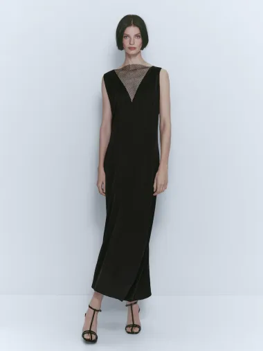 Duga haljina bez rukava, s mrežastim detaljem.