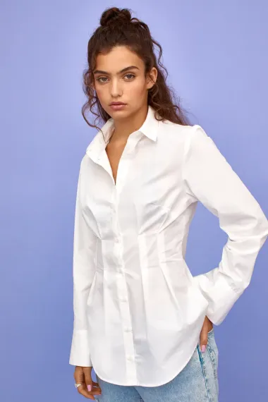 Ova bijela košulja lagano je strukirana, duža je i jednostavno ide uz sve - a posebice hlače tamnije boje.
