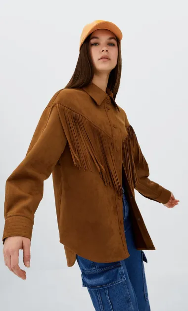 Natkošulja od imitacije brušene kože s resama u smeđoj boji idealna je za proljetnu kombinaciju s kaubojkama i širokim hlačama.