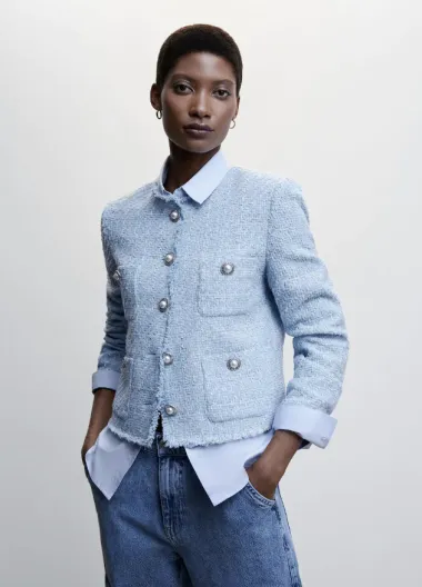 Jakna od tvida u nebo plavoj boji sa srebrnim gumbima s detaljima bisera.