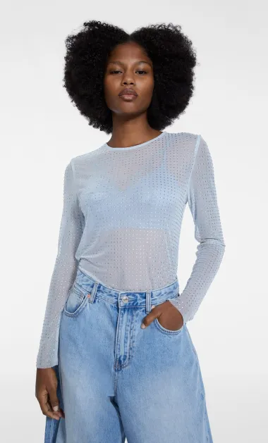 Prozirna majica od tila s detaljima cirkona, dugih rukava i okruglog ovratnika.