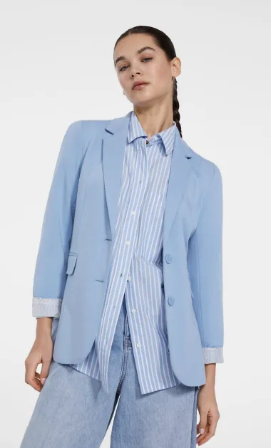 Pleteni svjetlo plavi blejzer s ovratnikom na preklop, podvrnutim rukavima i s jastučićima za ramena.