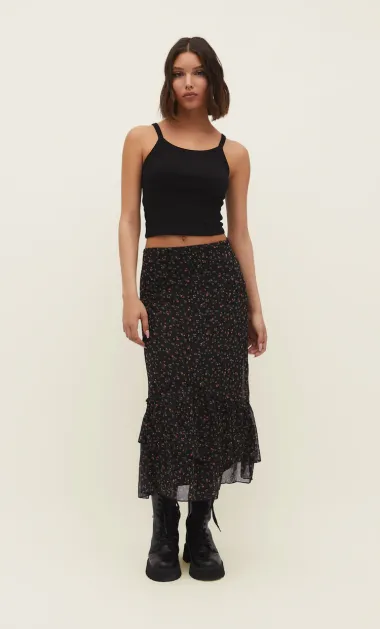 Asimetrična suknja s cvjetnim uzorkom ima nekoliko slojeva i vrlo je lepršava, a najbolje odgovara toplim ljetnim danima.