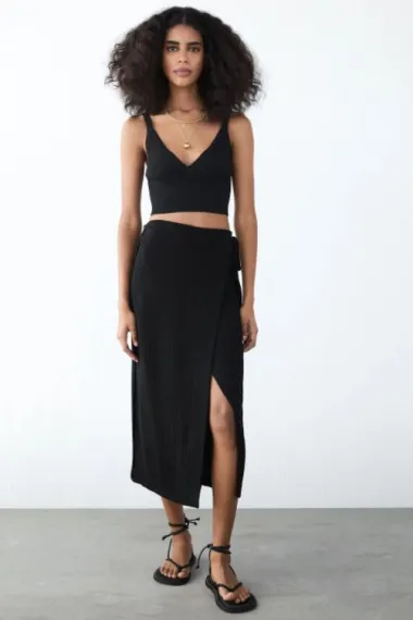 Ova crna midi suknja na preklop sjajno će se uklopiti u svaku proljetnu i ljetnu kombinaciju.