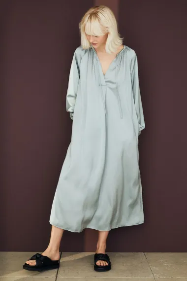 Lepršava haljina od satinirazirane tkanine s V-izrezom dobar je izbor u svim prigodama.