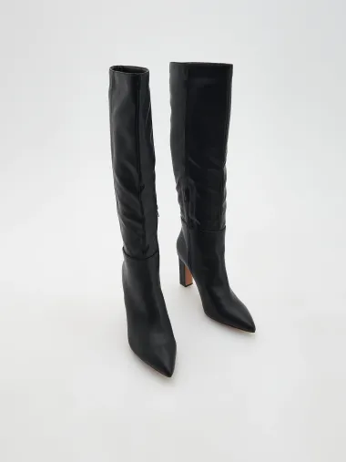 Kožne čizme do koljena, s platformom i visokom potpeticom te patentnim zatvaračem s unutarnje strane.
