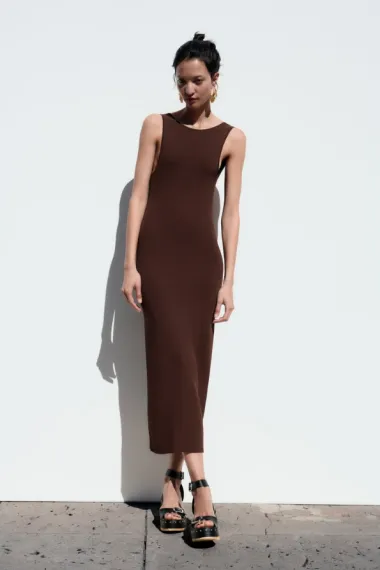 Midi haljina bez rukava s okruglim ovratnikom. S otvorenim leđima i u smeđoj boji.