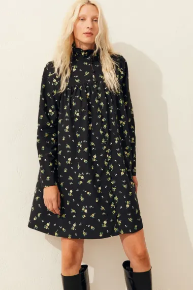 Lepršava haljina s floralnim motivima i povišenim ovratnikom idealan je izbor za prve proljetne dane, a odlično se slaže s visokim čizmama.