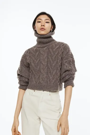 Ultra kratki pleteni sivo-smeđi džemper s povišenim ovratnikom i dugim rukavima.