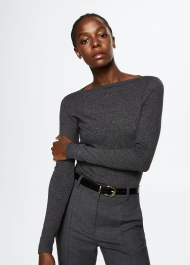 Rebrasta siva basic majica u nijansi antracita, s lađa ovratnikom, dugih rukava i uskog kroja.
