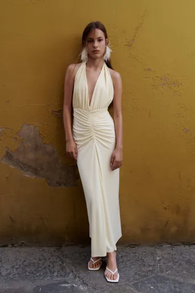 Haljina izrađena od pletene tkanine. Američki izrez s dubokim dekolteom. Drapirana tkanina. Podstava iste boje. Patentni zatvarač skriven u šavu sa strane.