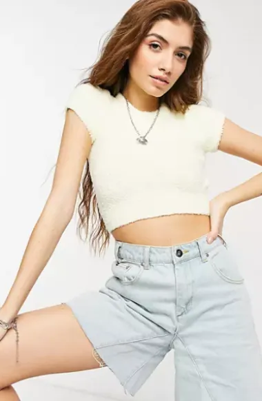 "Čupavi" ljetni top u prljavo bijeloj boji, s kratkim rukavima i vezanjem na leđima.