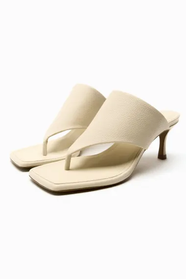 Kožne sandale s potpeticom i širokom trakom s pregradom za palac. Kvadratni vrh.
