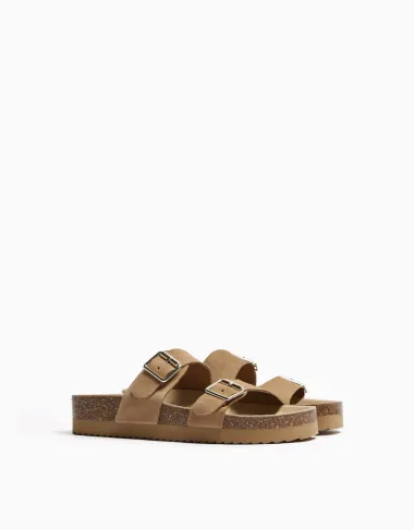 Ravne sandale od brušene kože s kopčama. Remenčić oko gležnja. Zaobljeni vrh.