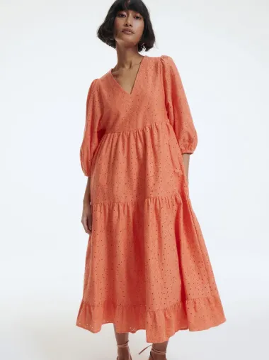 Midi haljina s okruglim ovratnikom i dugim rukavima s manžetama. Kombinirani rupičasti vez. Kombinirana podstava. Kopčanje gumbima sprijeda.