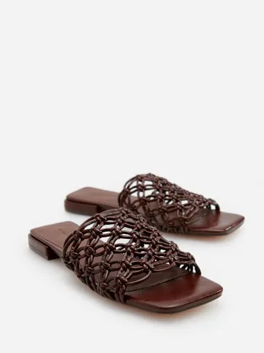Smeđe kožne sandale s potpeticom. Kožno gornjište s isprepletenim remenčićima.