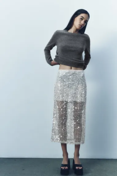 Midi suknja visokog struka s elastičnim pojasom i apliciranim šljokicama.