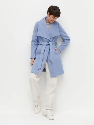 Ženstven i elegantan pastelno plavi kaput sa širokim ovratnikom super je izbor za prijelazni period.