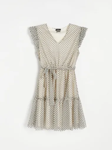 Romantična haljina V-izreza s volanima i točkastim printom. Osvježit će svaku kombinaciju.