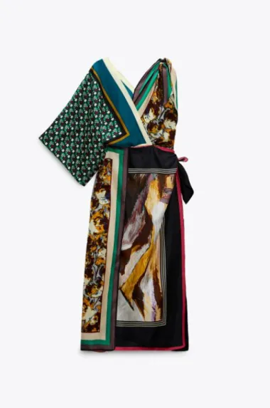 Svilena haljina s uzorkom ima V-izrez na preklop i asimetrične rukave za dodatnu posebnost.