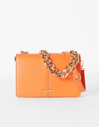 Clutch torbica s motivom harmonike i lancem u jarkoj narančastoj nijansi.
