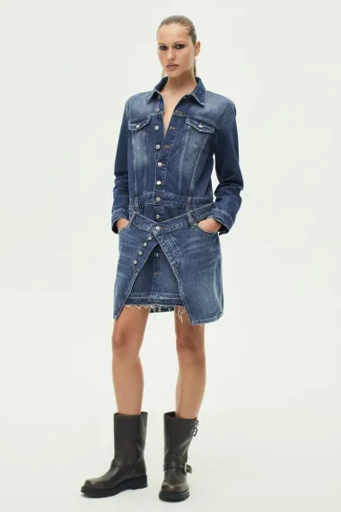 Tamna midi haljina ženstvenog kroja i prugaste visoke čizme sa zelenim i žutim prugicama izgledaju pomalo kaubojski, a upravo je to stil koji ova manekena voli. No traper haljina odlično se može stilizirati sa svim komadima u ormaru, te će lijepo pristajati uz tenisice, ravne cipele ili čizme. Zbog toga je mnogim ženama obavezan komad u ormaru.