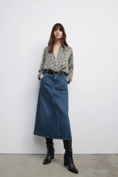 Duga traper suknja koja izgledom podsjeća na sedamdesete može se savršeno kombinirati, a da izgleda moderno.