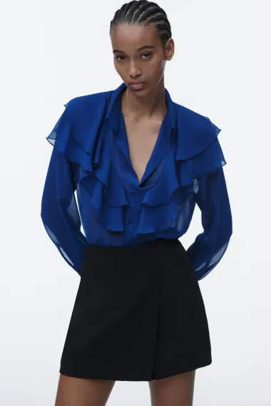 Košulja s otvorenim ovratnikom i dugim rukavima. Volani sprijeda. Kopčanje gumbima u istoj boji sprijeda.