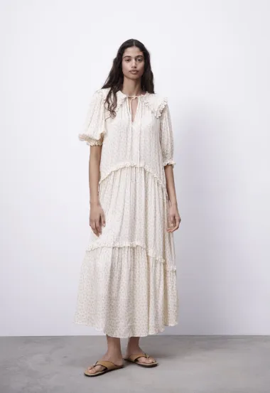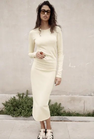 Midi haljina s okruglim izrezom i dugim rukavima. Kombinirana tkanina u istoj boji s volanima.