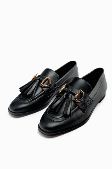 Ravne mokasinke s ukrasnom metalnom kopčom i kićankama na prednjem dijelu.