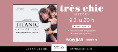 “Tres chic” filmska večer u četvrtak, 9. veljače u 20 h, ugostit će, prema mnogima, najveći filmski spektakl svih vremena – film Titanic u 3D formatu.